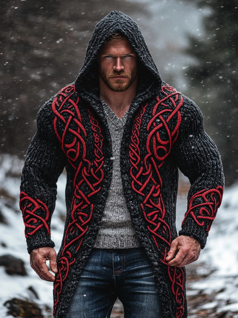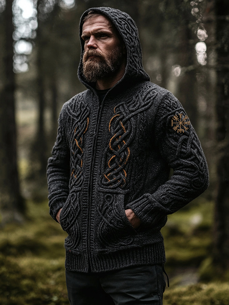 Men's Vintage Viking Inspired Celtic Jacquard Hooded Sweater Cardigan
