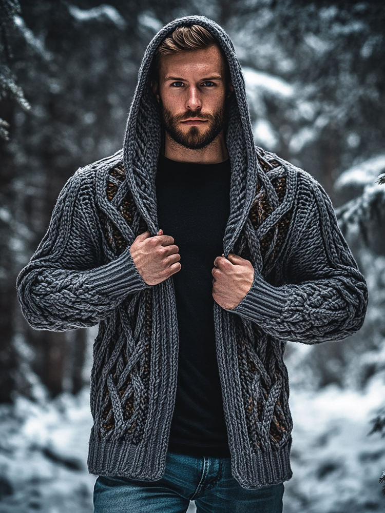 Men's Retro Viking Tribal Celtic Contrast Patchwork Chunky Hooded Cardigan Sweater
