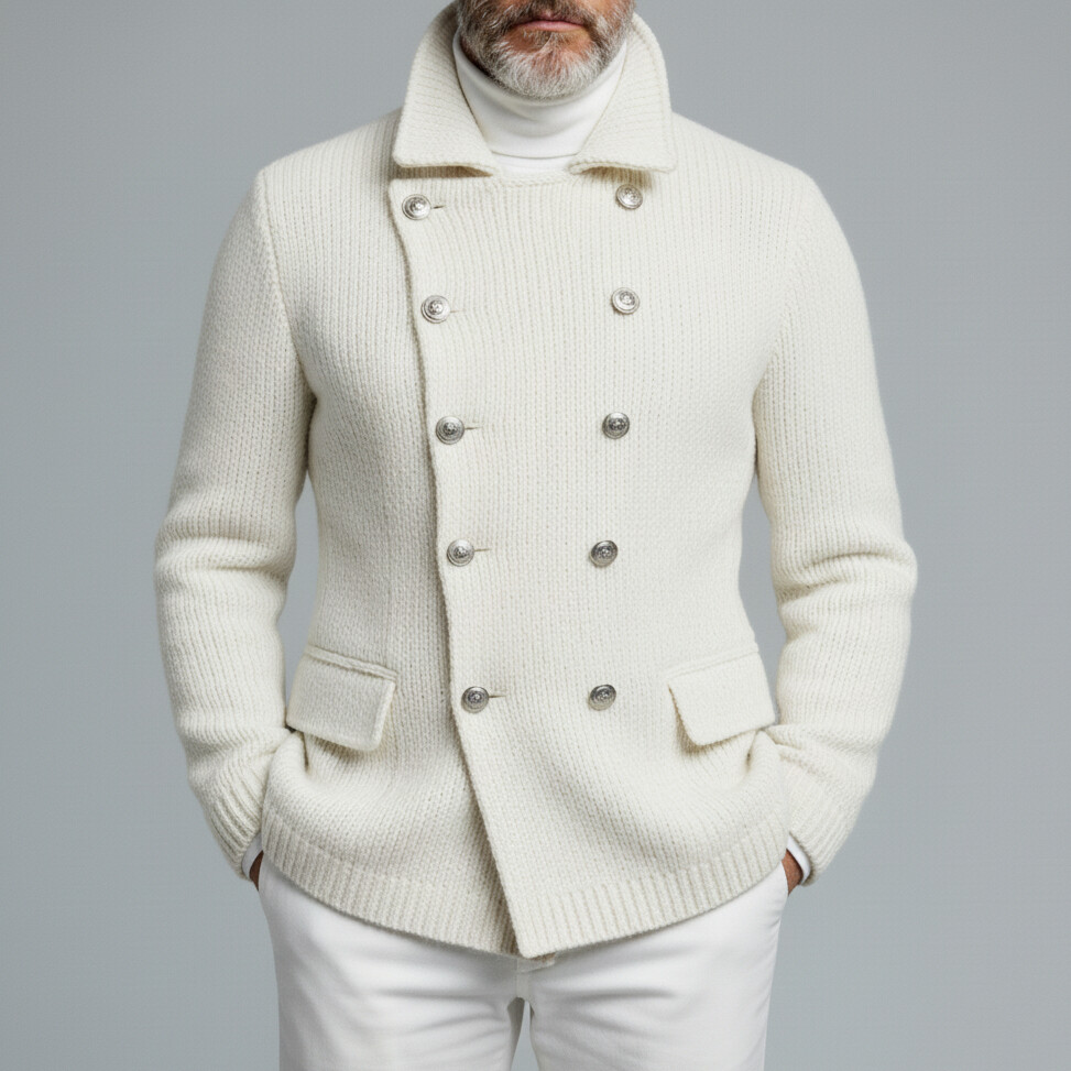 Men's White Ribbed Knit Double Breasted Turndown Collar Long Sleeve Sweater Cardigan