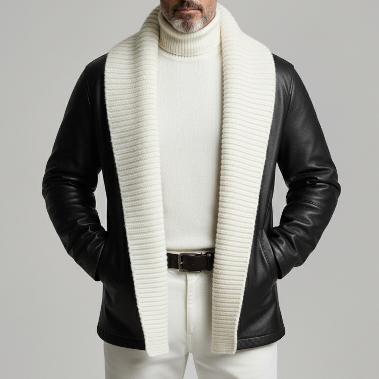 Men's Black Ribbed Knit Shawl Lapel Long Sleeve Pockets PU Leather Cardigan