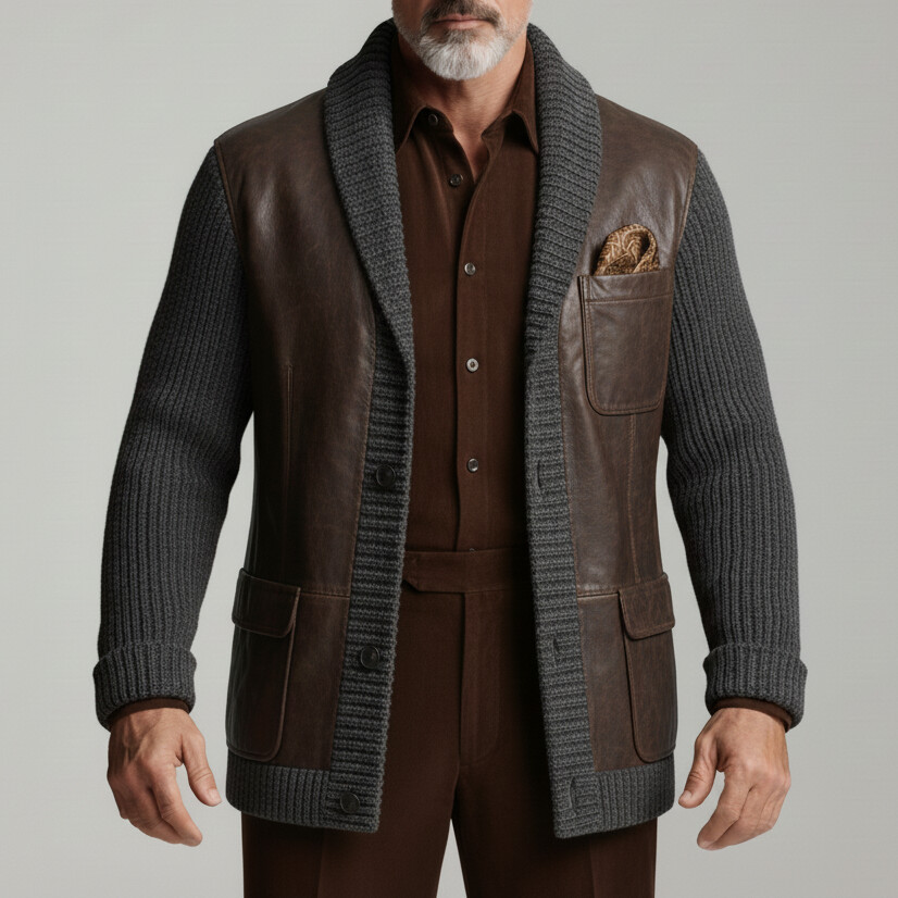 Men's Brown And Gray PU Patchwork Knit Shawl Lapel Single Breasted Pockets Long Sleeve Sweater Cardigan