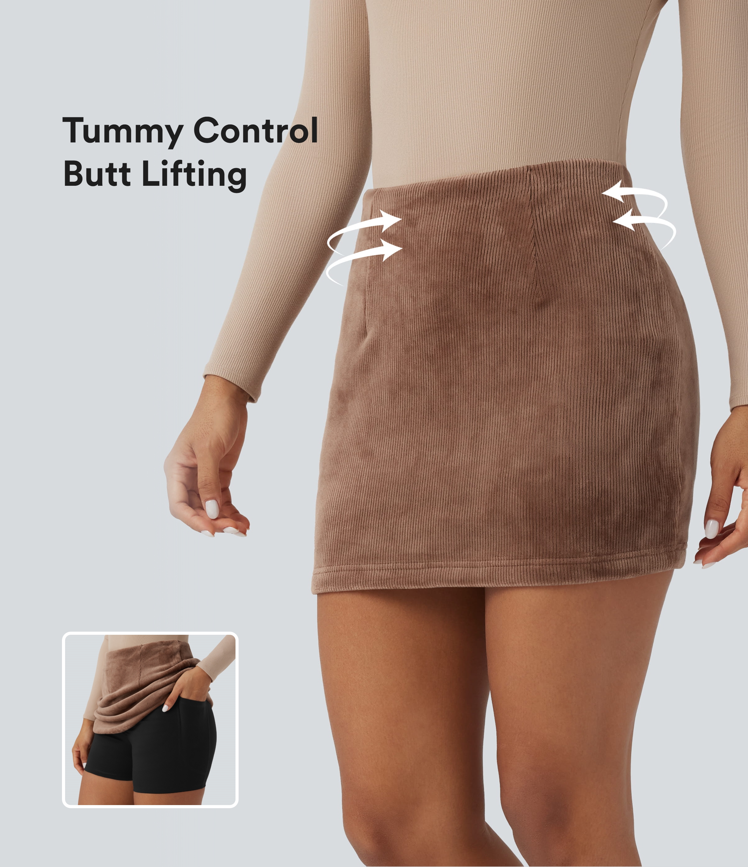High Waisted Tummy Control Butt Lifting Fleece Corduroy Bodycon Mini Casual Skirt with Pockets