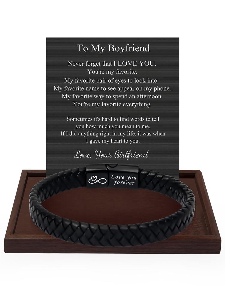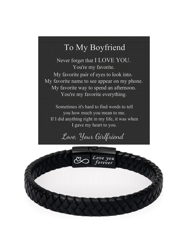 【Unique Gift Idea】: This leather bracelet stands out as a thoughtful gift for special occasions like Christmas or Valentine's Day. 【Durable Material】: Constructed from artificial leather, ensuring longevity and maintaining its appearance through various seasons. 【Charming Knotted Design】: Features an attractive knotted design, adding a touch of individuality that distinguishes it from standard bracelets. 【Includes Gift Card】: Each bracelet comes with a gift card, enhancing the gift-giving experience for your boyfriend on any celebration. 【Suitable for All Seasons】: Designed for wear throughout the year, making it a versatile accessory that can be worn on any occasion.