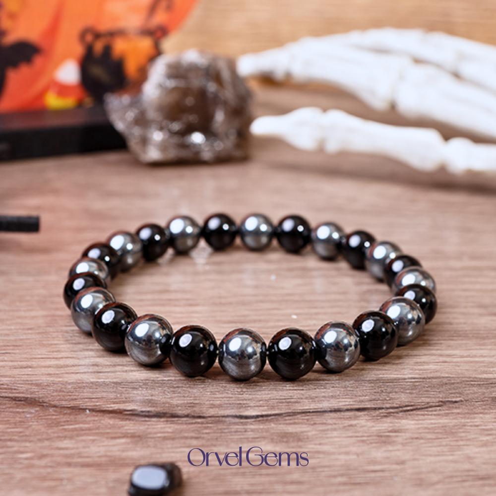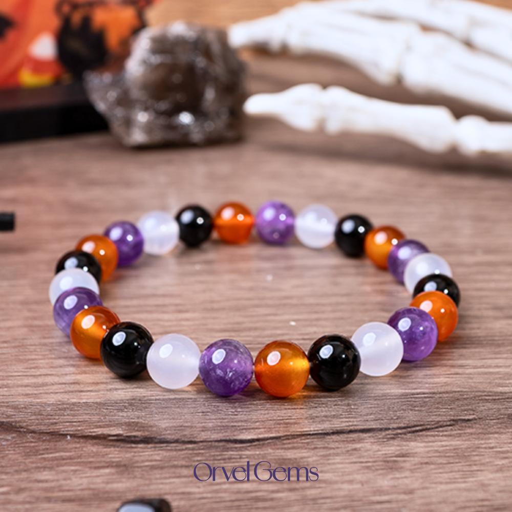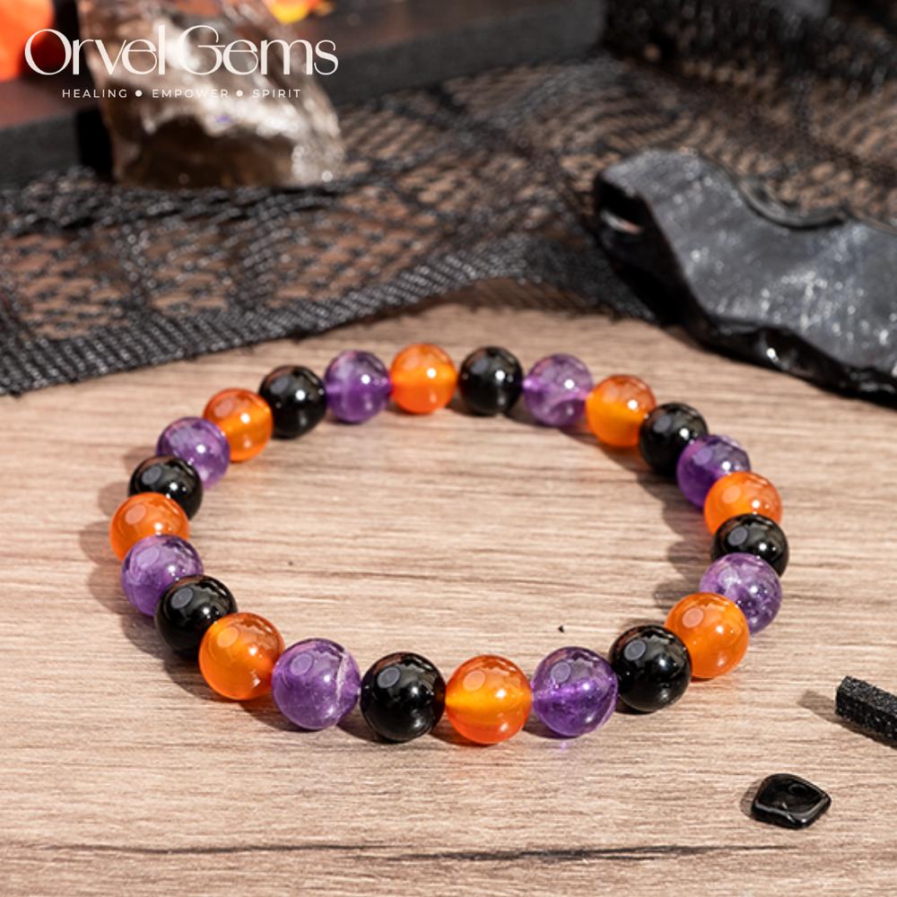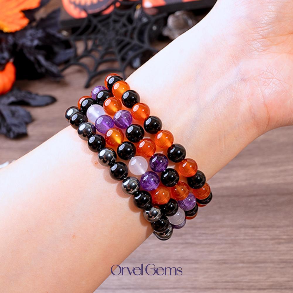 Halloween Protection Crystal Beaded Bracelet – Natural Stone Amethyst Black Onyx Hematite Tigers Eye Agate 8mm beads – Spiritual Grounding, Negative Energy Cleansing, Gift for Women, Men, Friends, Family, Halloween Party, Witchy Jewelry, Protection Amulet