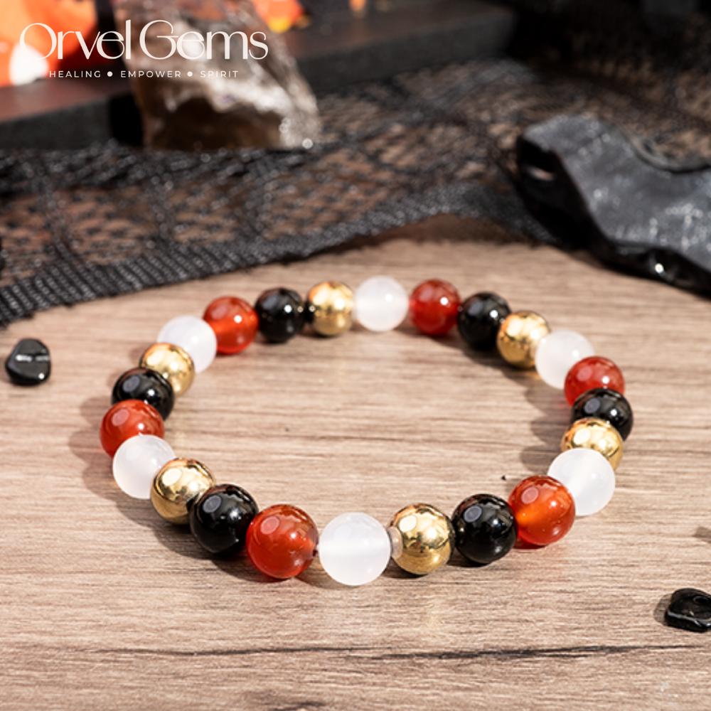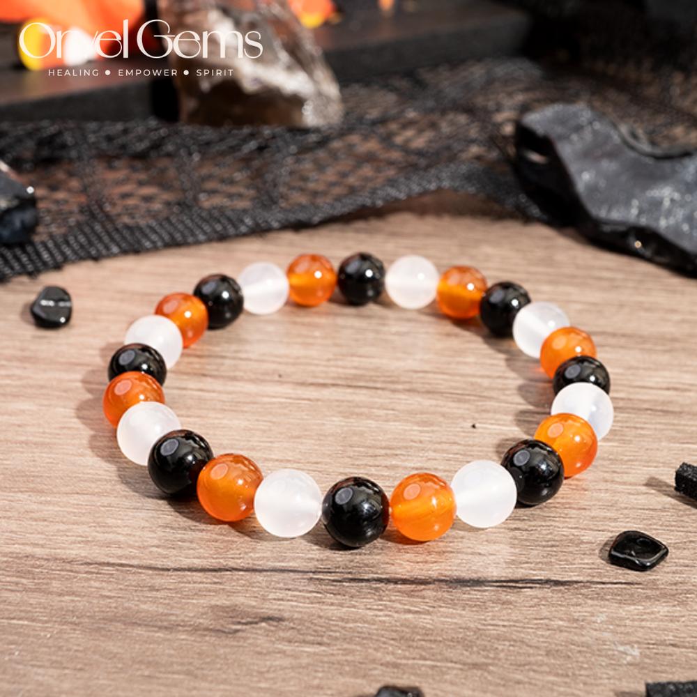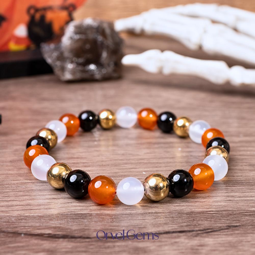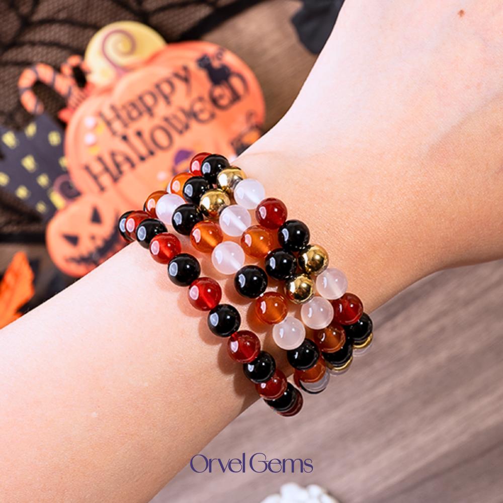 Halloween Protection Crystal Beaded Bracelet – Natural Stone Amethyst Black Onyx Hematite Tigers Eye Agate 8mm beads – Spiritual Grounding, Negative Energy Cleansing, Gift for Women, Men, Friends, Family, Halloween Party, Witchy Jewelry, Protection Amulet