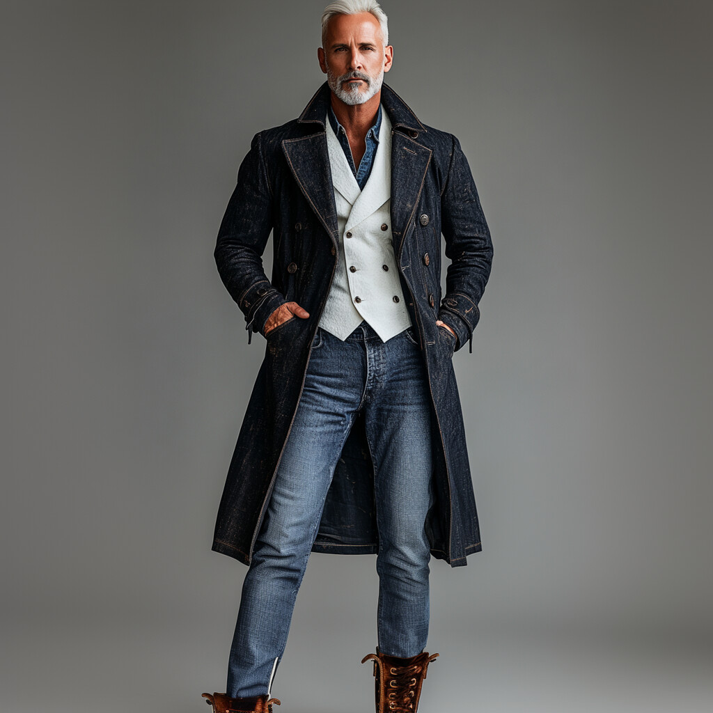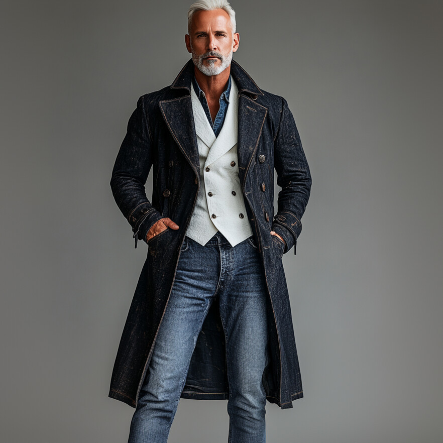 Men's Long Sleeve Double Breasted Lapel Collar Denim Trench Coat