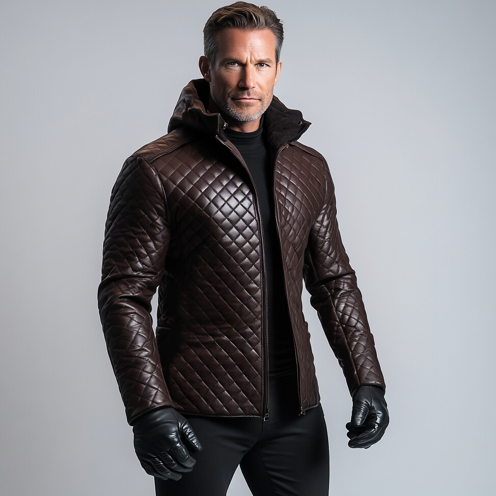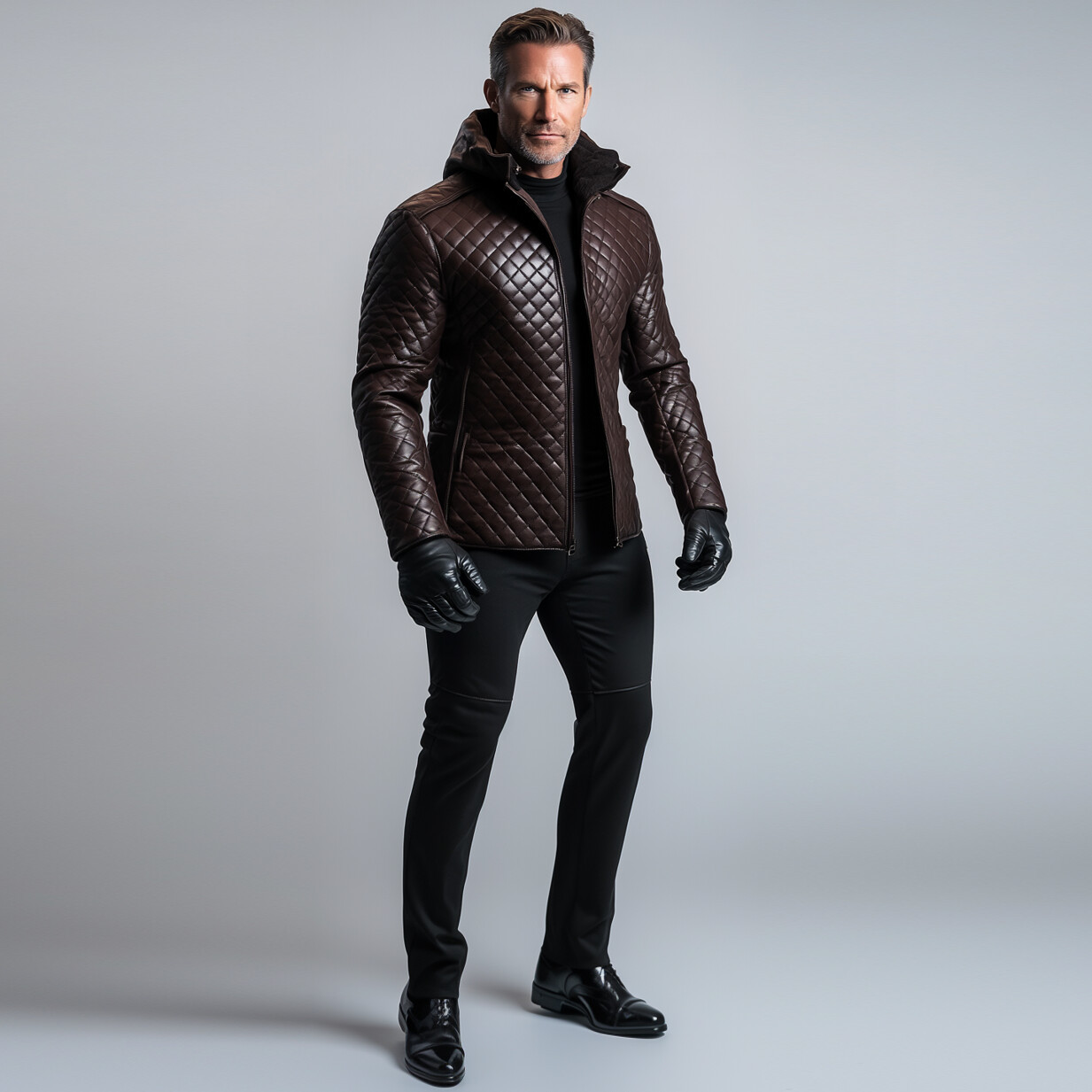 Men's PU Leather Quilted Zipper Hooded Jacket