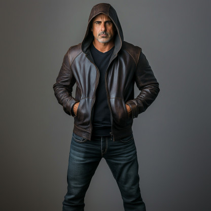 Men's PU Leather Slant Pocket Zipper Long Sleeve Hooded Jacket