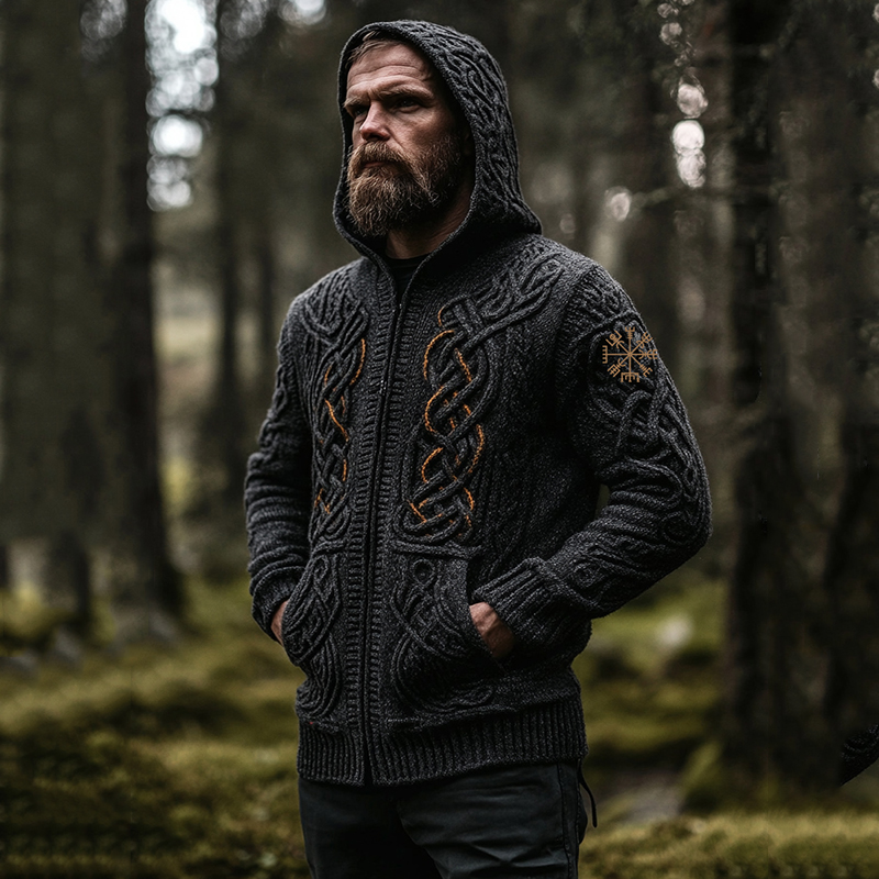 Men's Vintage Viking Inspired Celtic Jacquard Hooded Sweater Cardigan