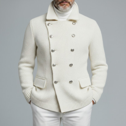 Men's White Ribbed Knit Double Breasted Turndown Collar Long Sleeve Sweater Cardigan