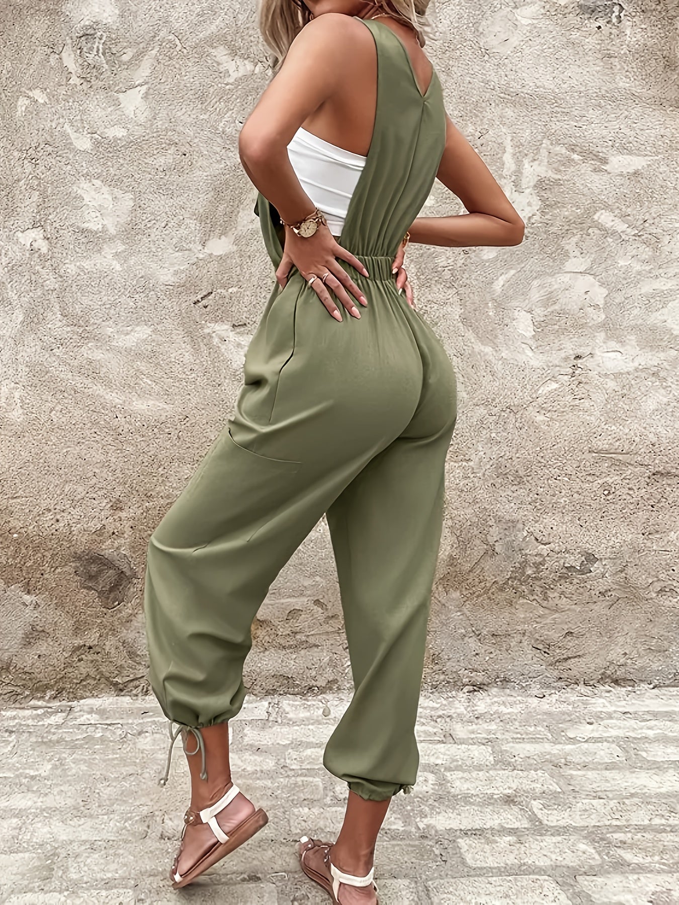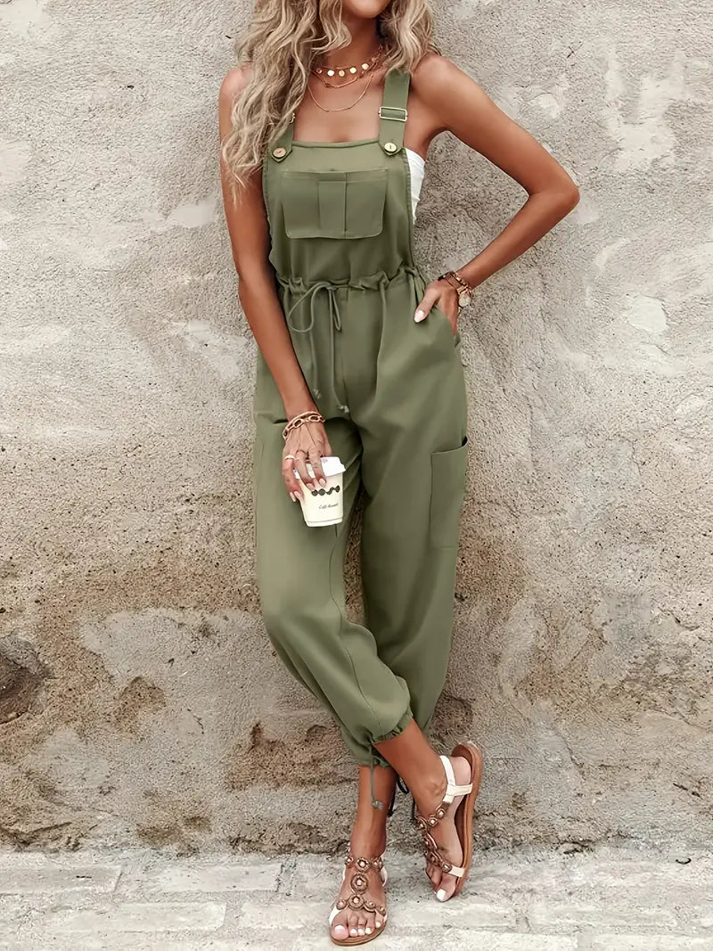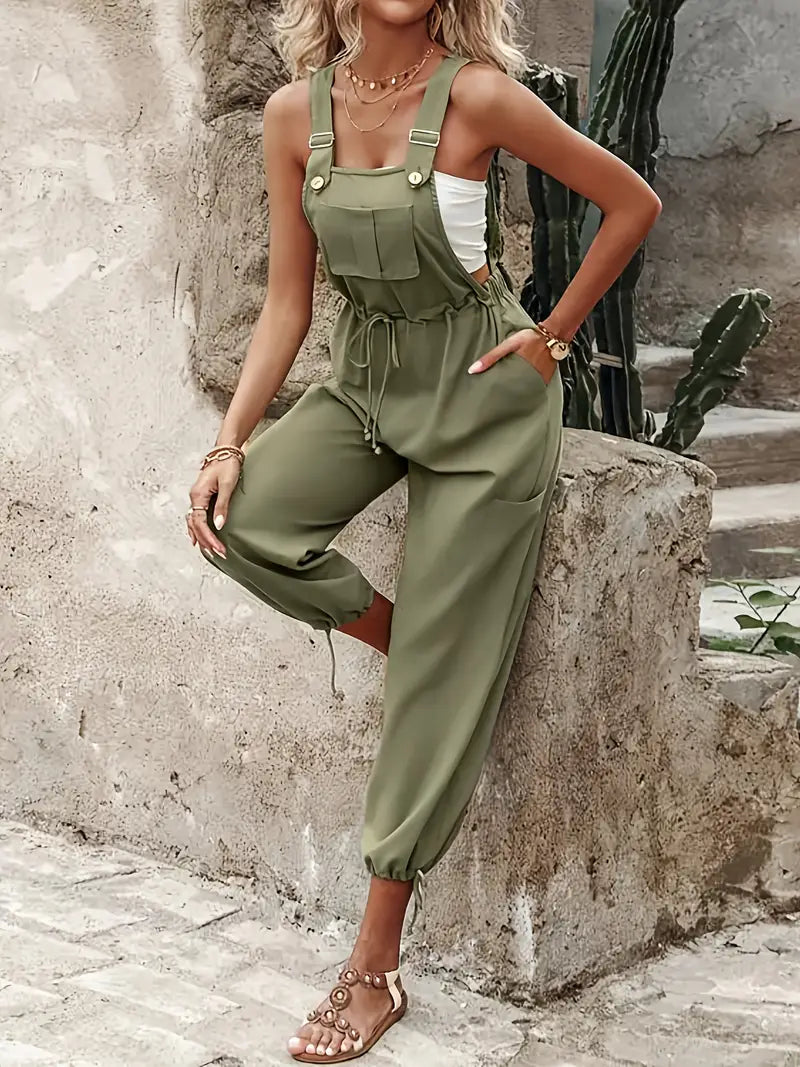 Crafted from a breathable, soft cotton-blend with a fluid drape, this jumpsuit features adjustable front straps, a cinched waist, and jogger-style cuffs for a flattering fit. Oversized patch pockets and a front bib add functional edge. Finished with a streamlined, zipper-free design for effortless wear.