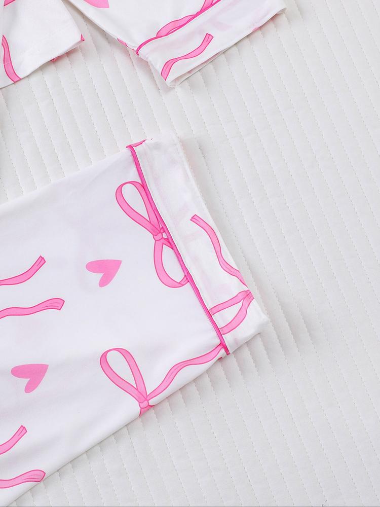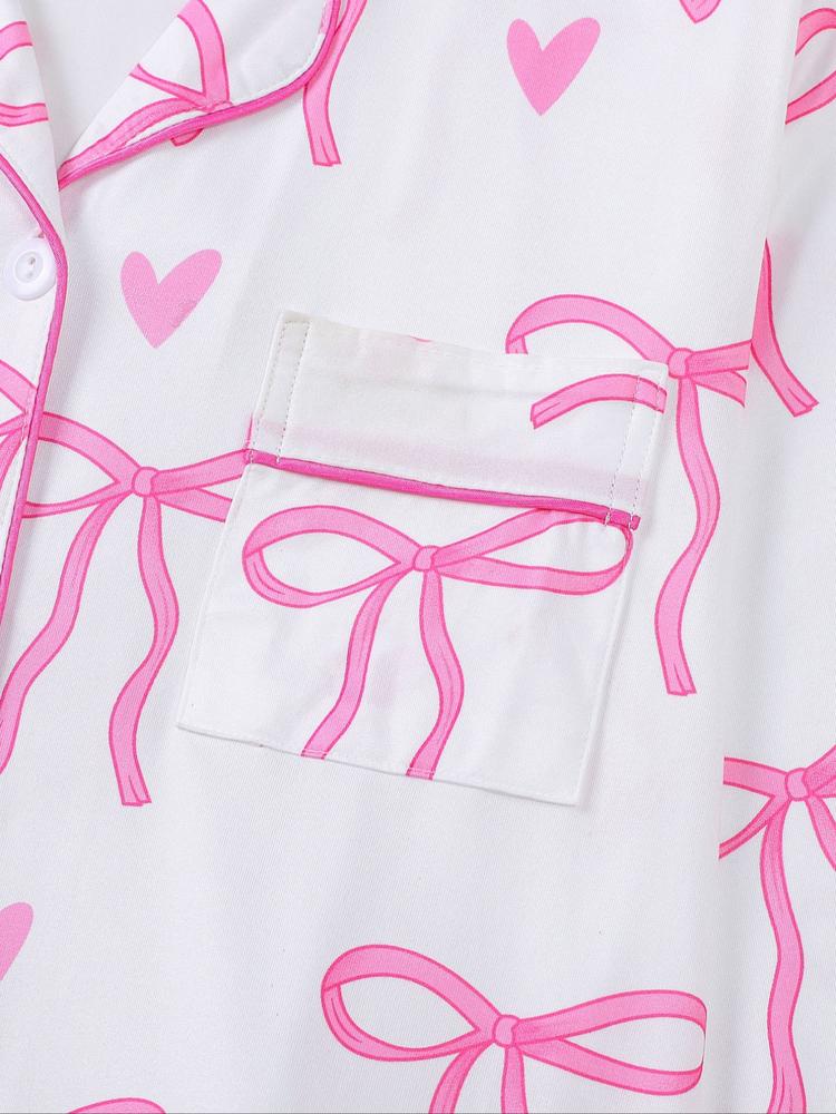 Women's 2-Piece Pajama Set, Bowknot Print, Holiday Party Sleepwear, Soft Shirt Collar Top & Elastic Pants, Casual Home Wear