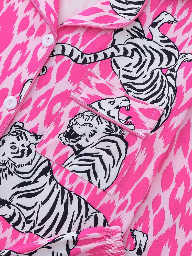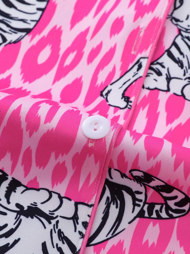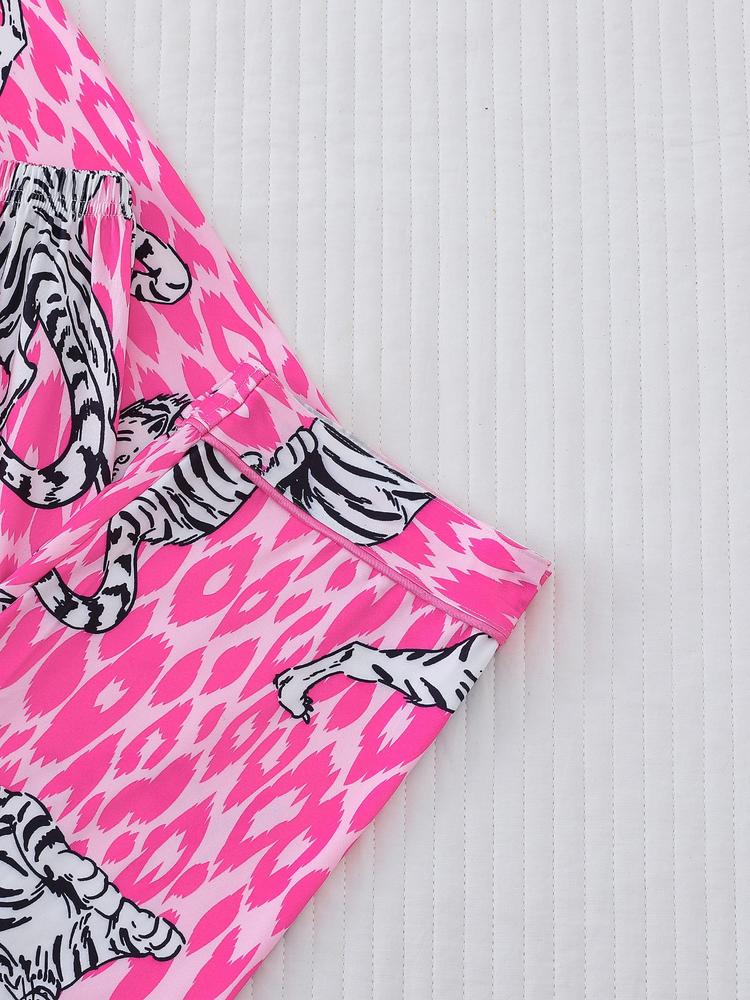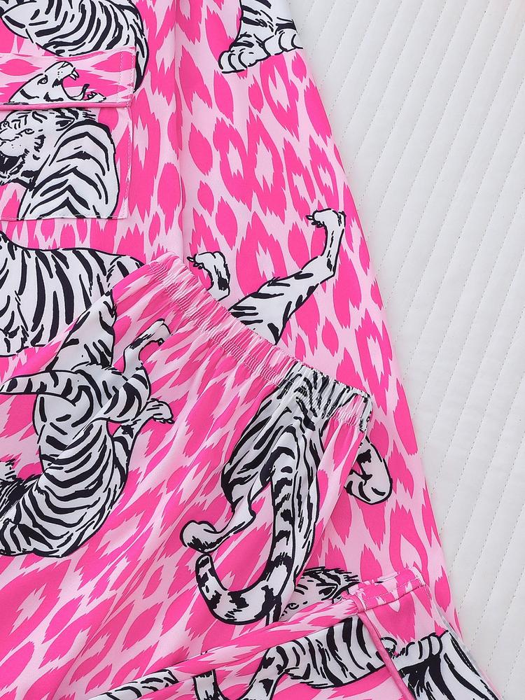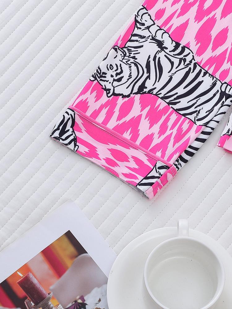 Women's Tiger Print Pajama Set, Fall & Winter Casual Sleepwear, Comfortable Long Sleeve Button-Up Top and Elastic Pants, Home & Outdoor Wear